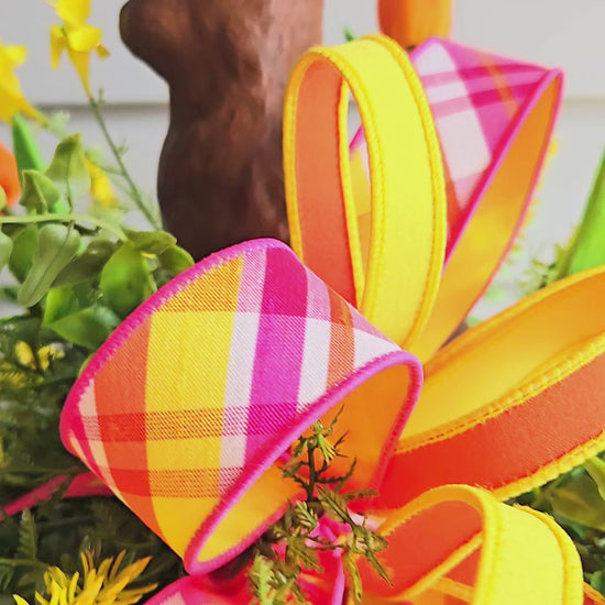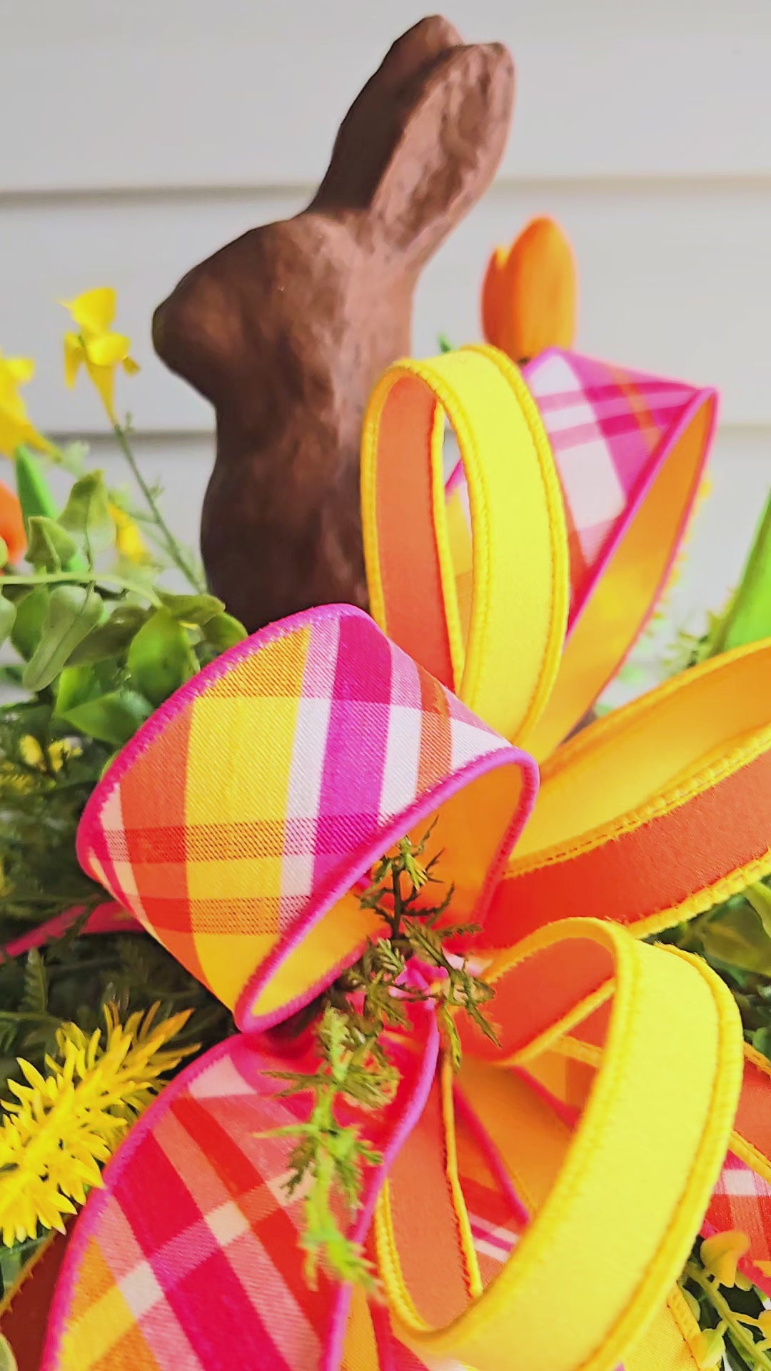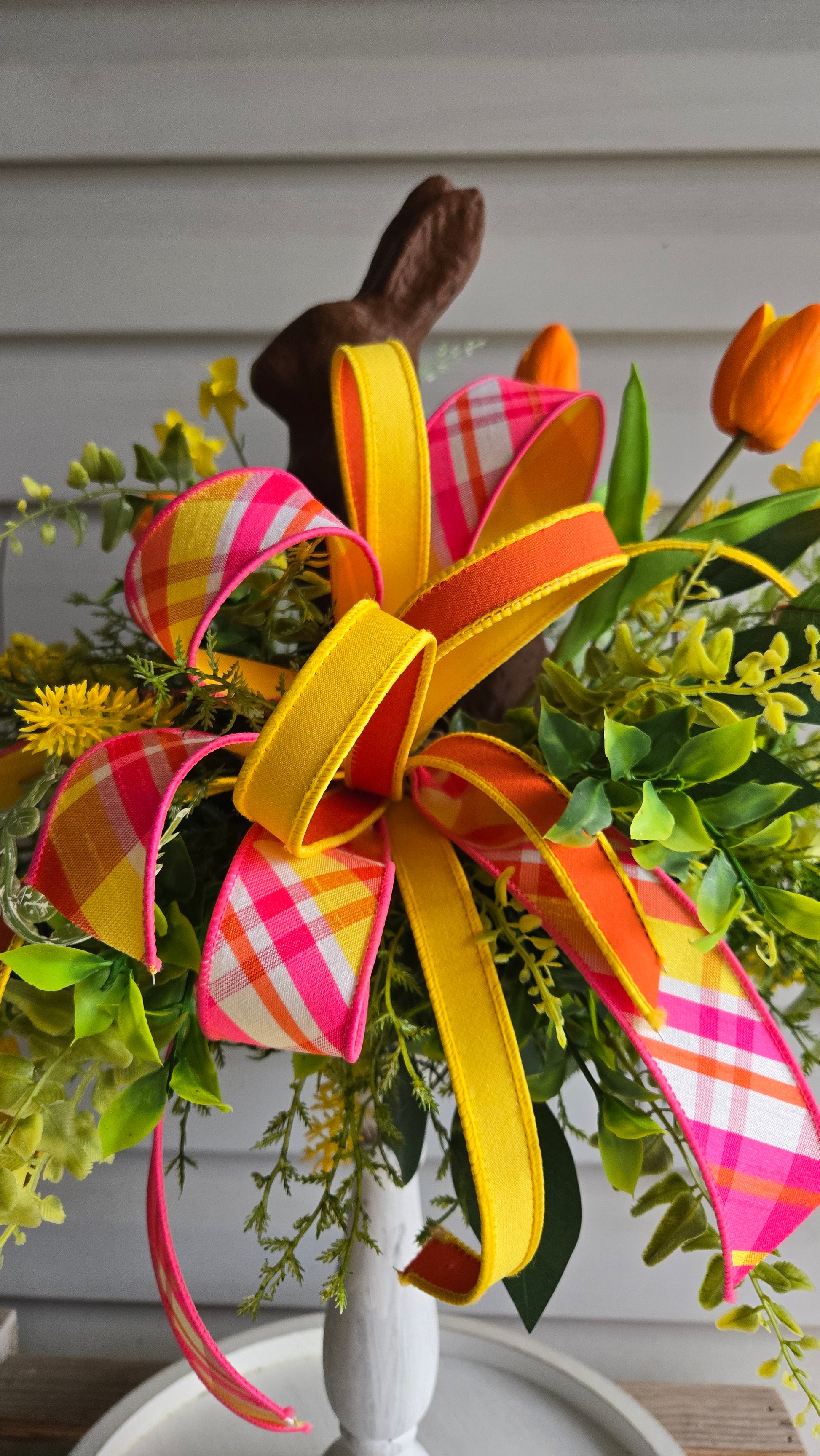 A classic chocolate bunny peeks through lush greenery, cheerful florals, and vibrant tulips, finished with a layered designer bow in sunny yellows and warm pink tones. The result feels fresh, welcoming, and just a little bit whimsical without sacrificing sophistication.