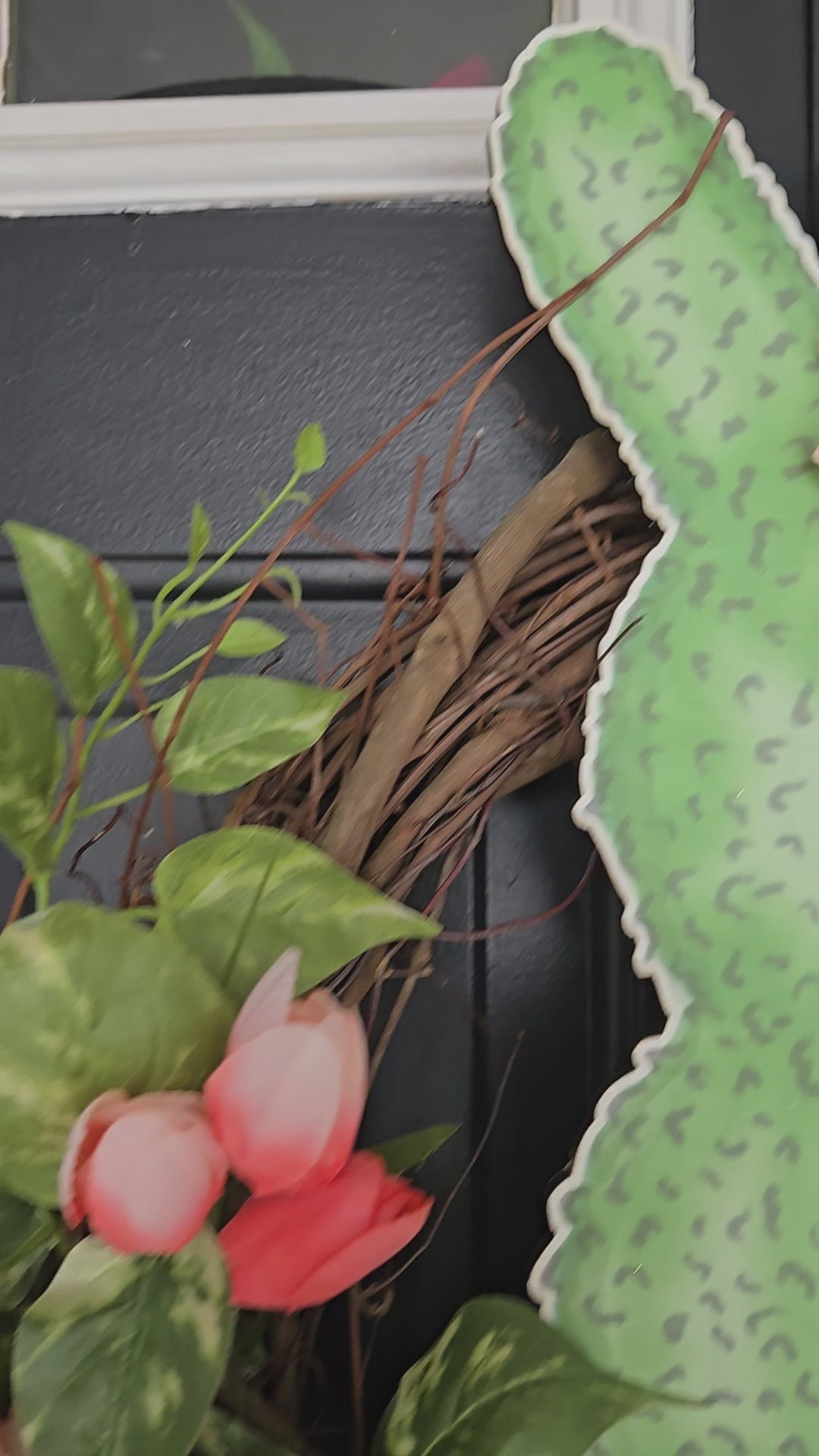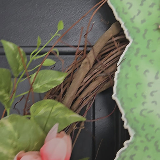 Welcome spring in the sweetest way with this handcrafted topiary grapevine wreath. Designed on a natural grapevine base, this whimsical wreath features a charming wood bunny topiary accent surrounded by lush pothos and dill greenery, soft pastel florals, and trailing vines and twigs for a fresh garden-inspired look.