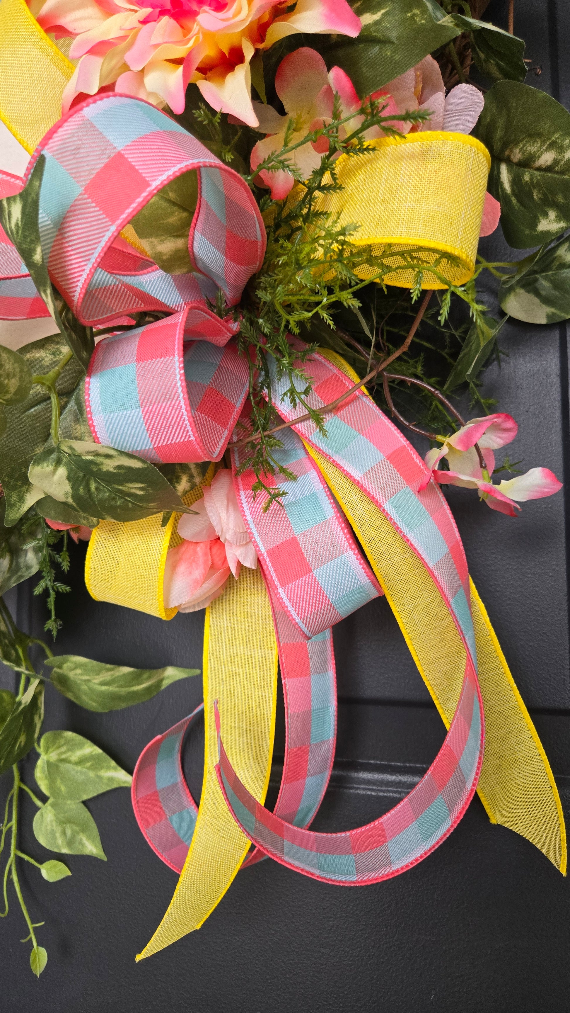 Beautiful peach and pink florals add a pop of seasonal color, while a cheerful layered bow in pastel plaid and bright yellow ribbon brings a playful Easter touch. This wreath is perfect for welcoming guests during not just for the Easter season but throughout all spring.
