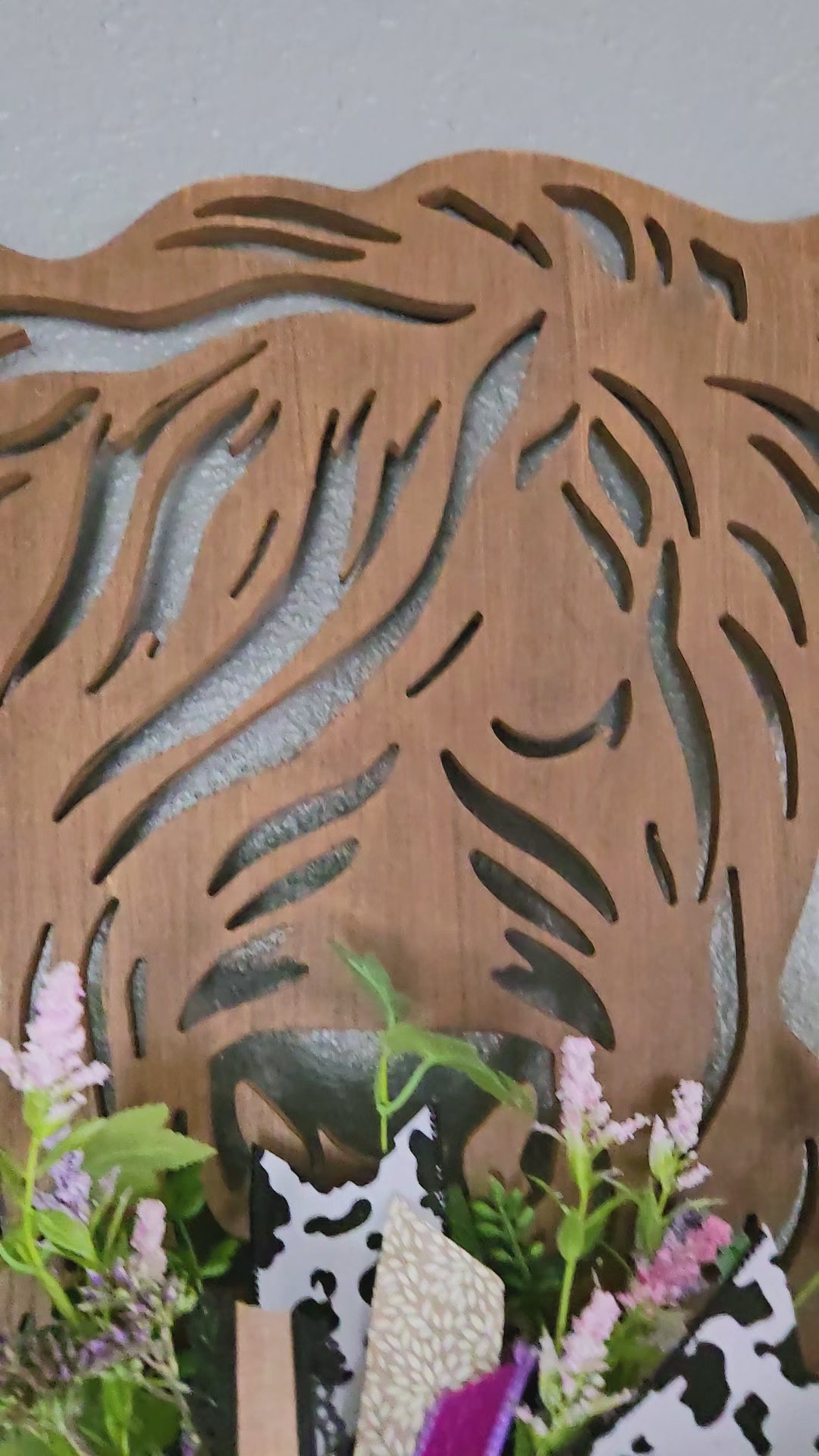 Measuring approximately 24 inches wide by 36 inches long, this oversized piece is a true focal point. The beautifully detailed wooden Highland cow silhouette adds warmth and character, while the lush floral and greenery arrangement softens the design with movement and texture.