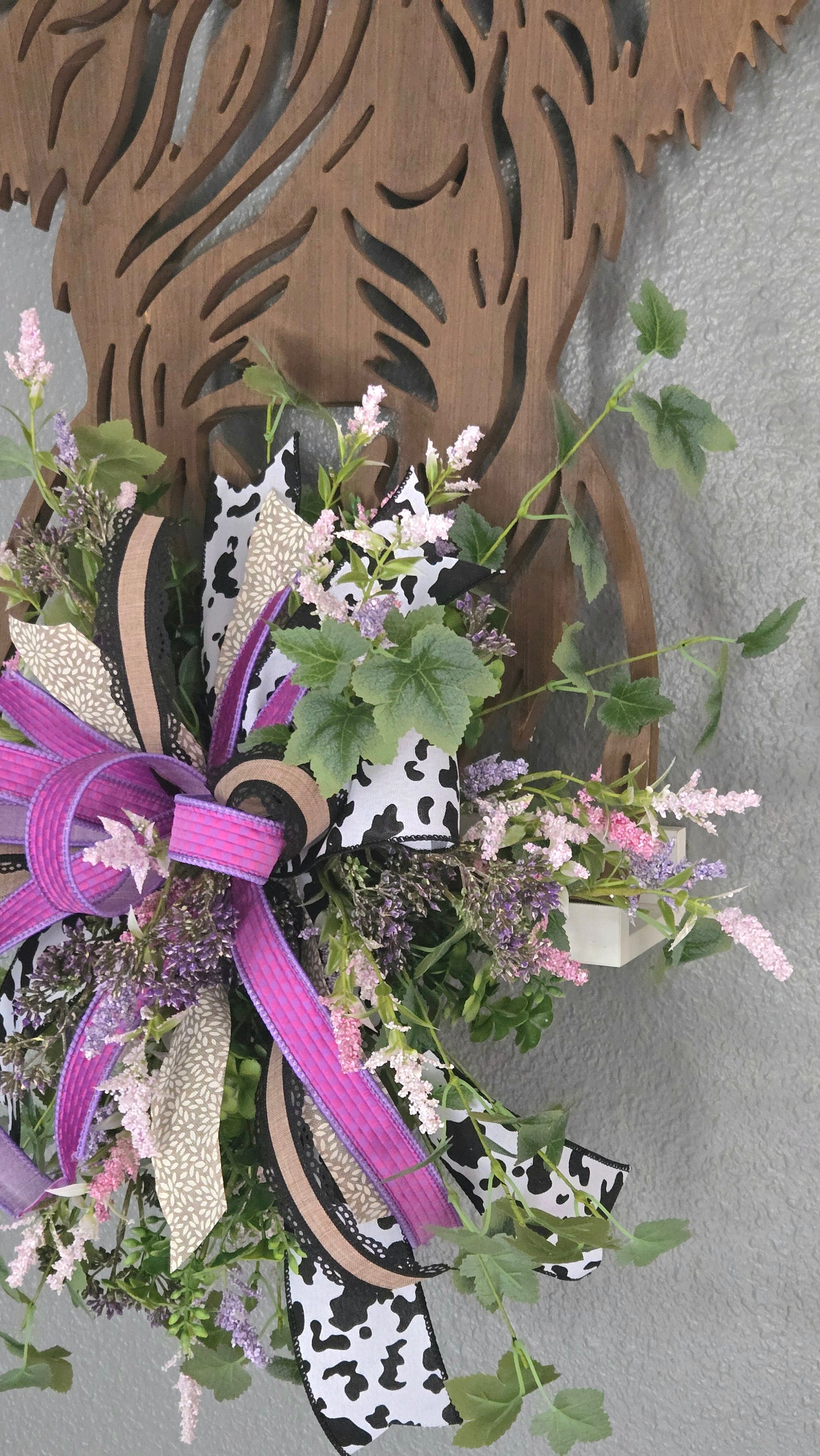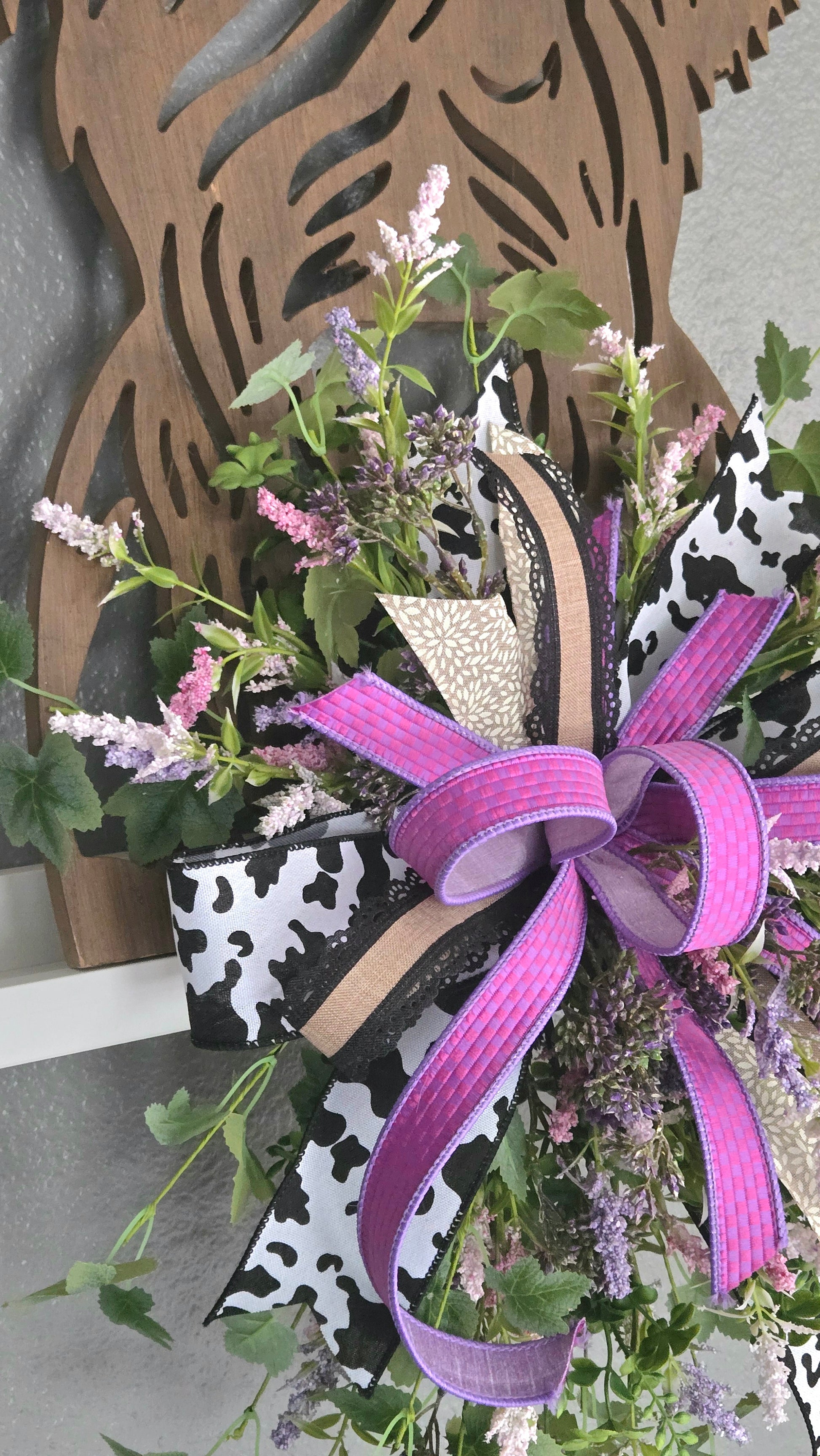 Layered ribbons in cow print, natural neutrals, and rich purple tones create depth and contrast, giving this piece a perfect blend of rustic, western, and modern farmhouse style. Wispy greenery and soft florals cascade naturally for an organic, high-end finish.