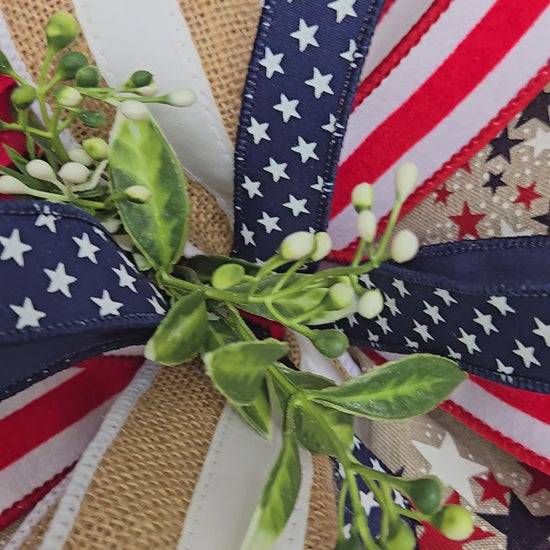 Celebrate the heart of Americana with this handcrafted patriotic wreath, designed to make a bold and welcoming statement for your home. Perfect for 4th of July, Memorial Day, Labor Day, or summer-long display, this wreath blends classic red, white, and blue tones with lush greenery for timeless charm.
