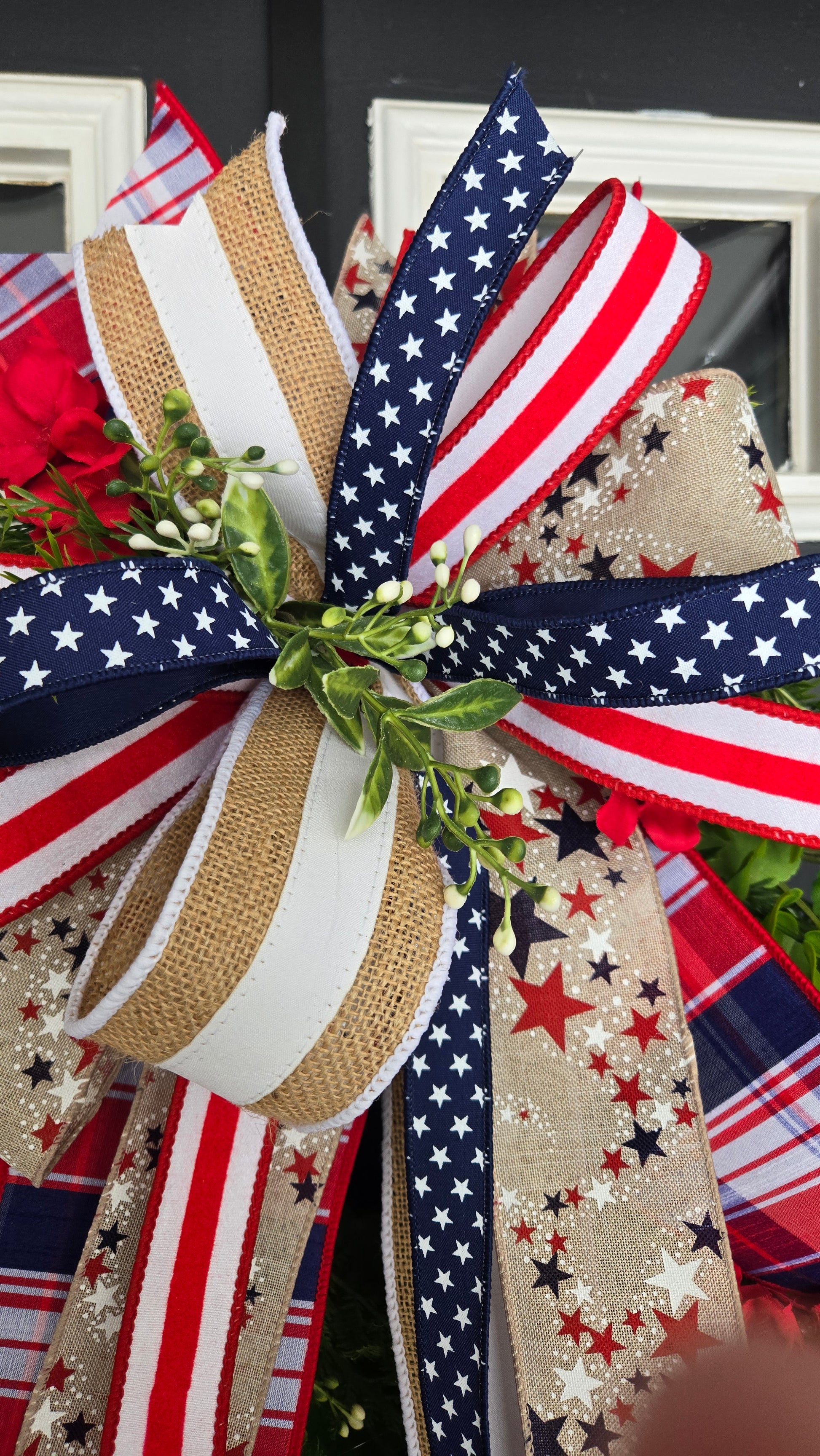 This wreath features a full base of realistic greenery accented with vibrant red geraniums and finished with an eye-catching oversized bow made from layered patriotic ribbons—stars, stripes, plaid, and burlap textures come together for a rich, dimensional look. The cascading bow adds movement and elegance while honoring traditional American style.
