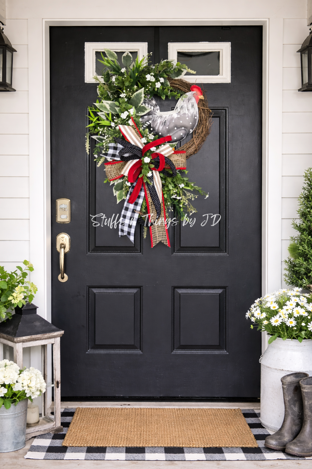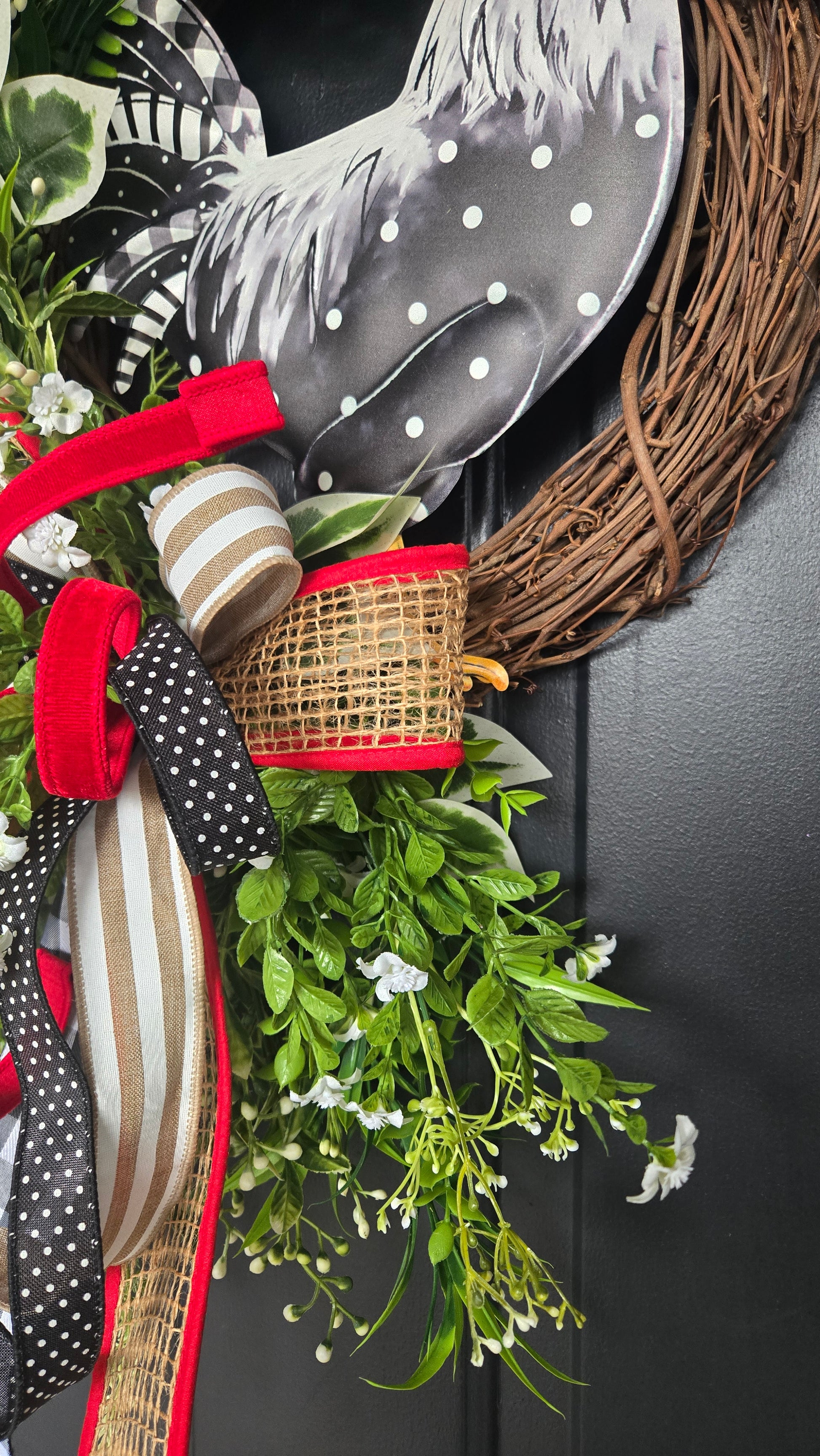 A charming black-and-white rooster centerpiece brings a welcoming farmhouse feel, while abundant faux greenery and delicate white florals add softness and texture. The layered bow features a mix of burlap, buffalo check, polka dots, and rich red velvet accents—perfectly balancing rustic charm with a cozy, curated look.
