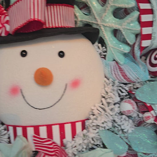 Whimsical Snowman Christmas Wreath with Rag Bow – Peppermint Holiday Door Decor in Red, White & Aqua