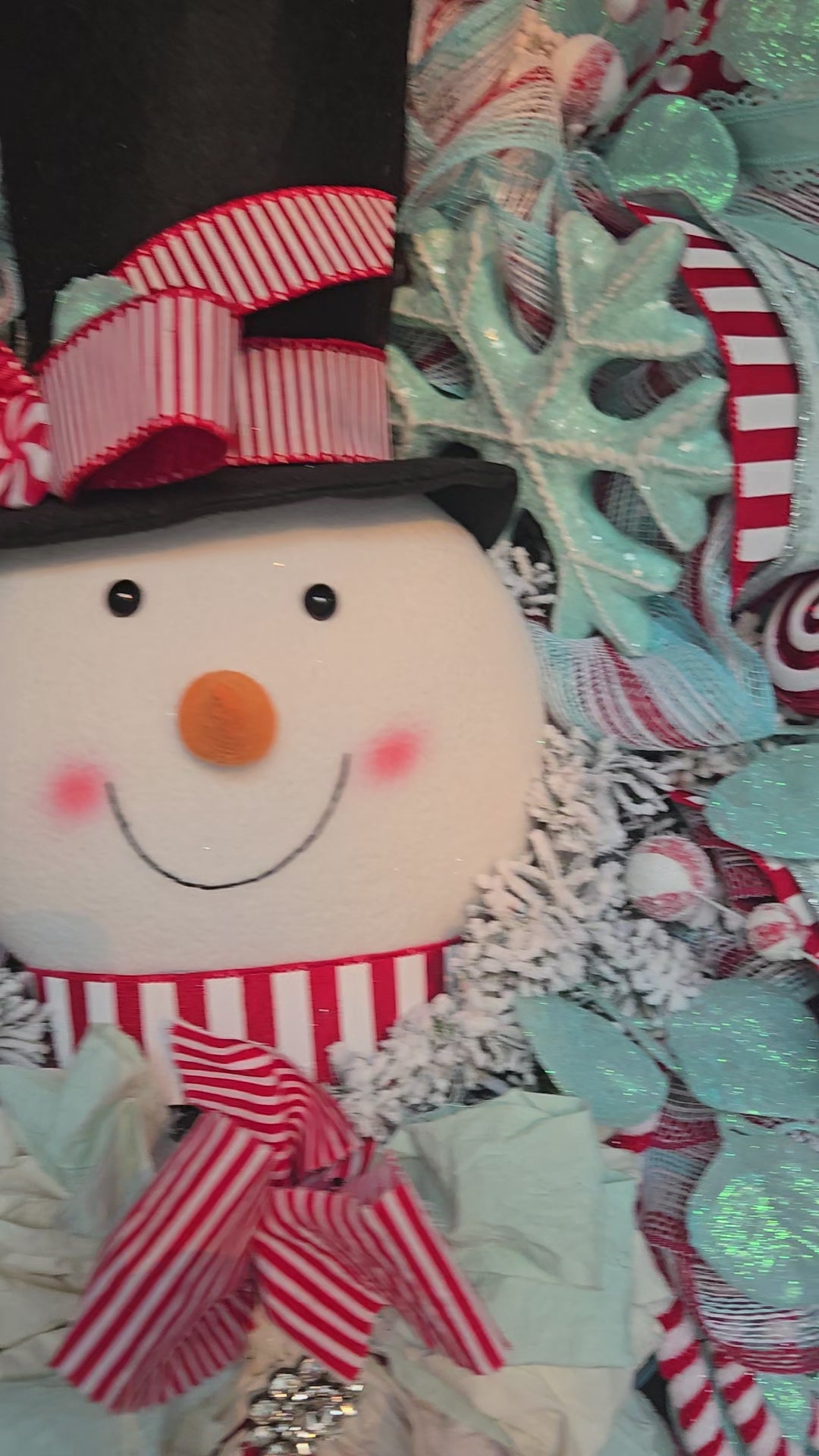 Add a burst of festive cheer to your holiday décor with this Whimsical Snowman Wreath 🎅❄️. Featuring a jolly snowman in a tall black hat, surrounded by glittering snowflakes, peppermint candies, and ribbons in red, white, and aqua, this design is all about holiday fun.