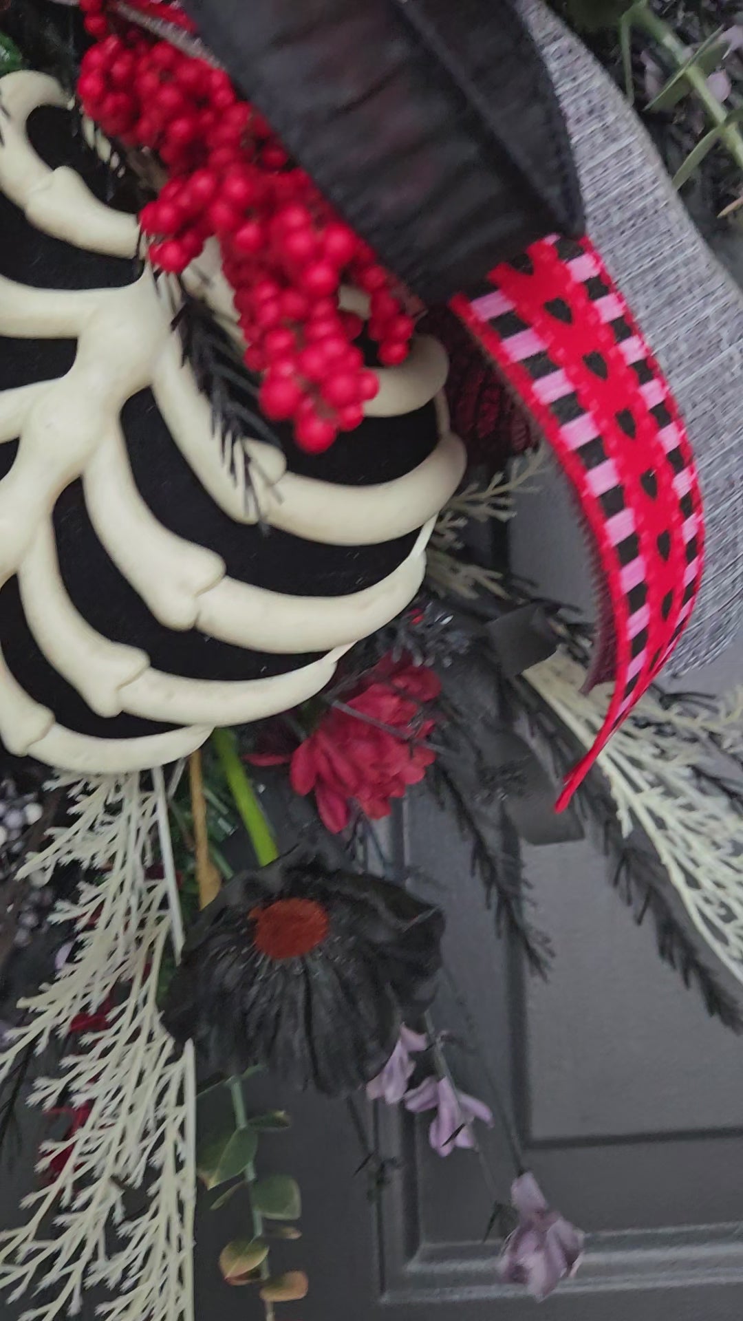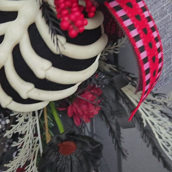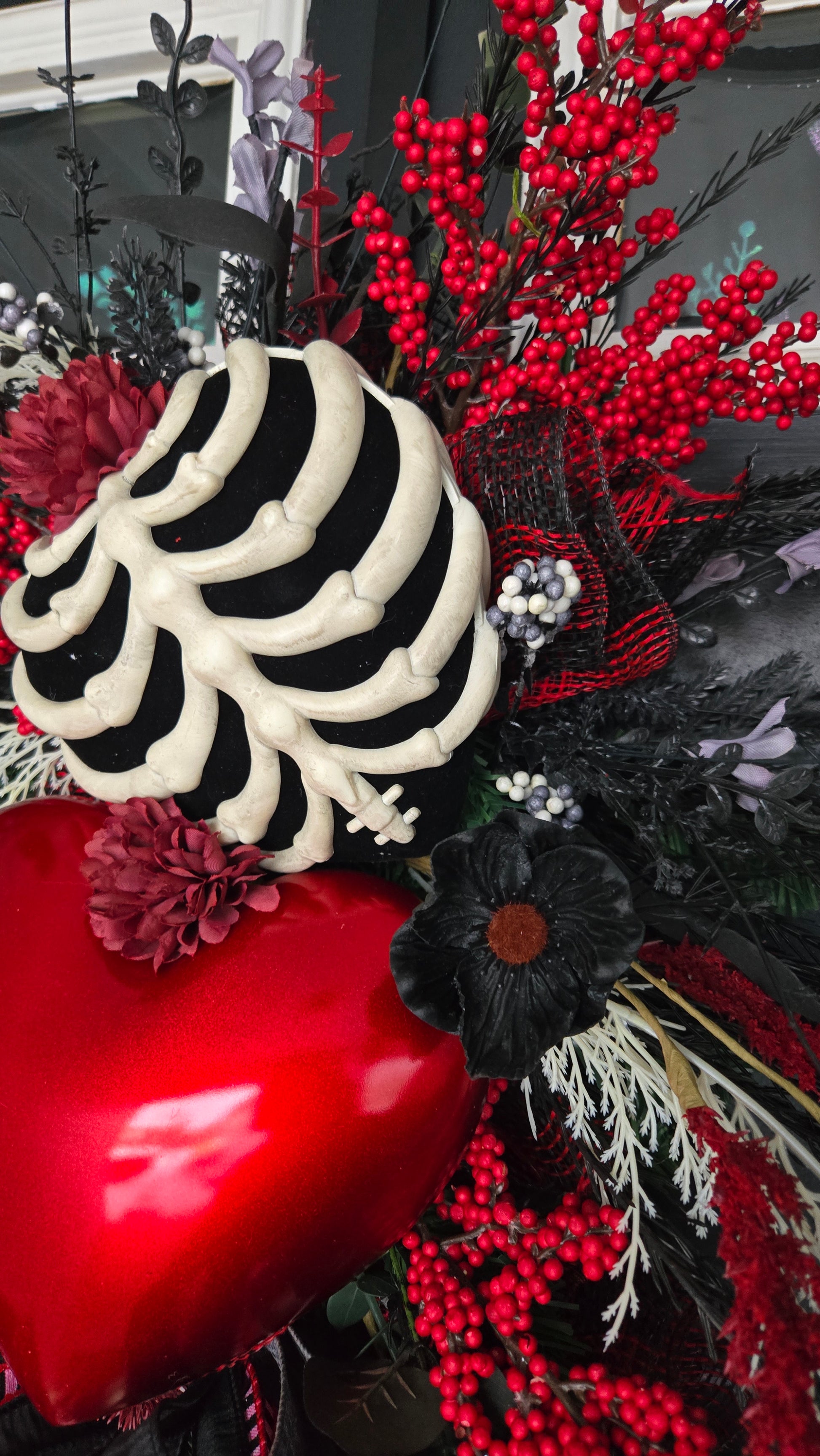 Created for those who have learned how to protect themselves without shutting down their heart, this dark, moody door swag blends bold symbolism with refined design. A vivid red heart anchors the arrangement, surrounded by black florals, dramatic greenery, and exposed bone elements that speak to strength, boundaries, structure, and survival.
