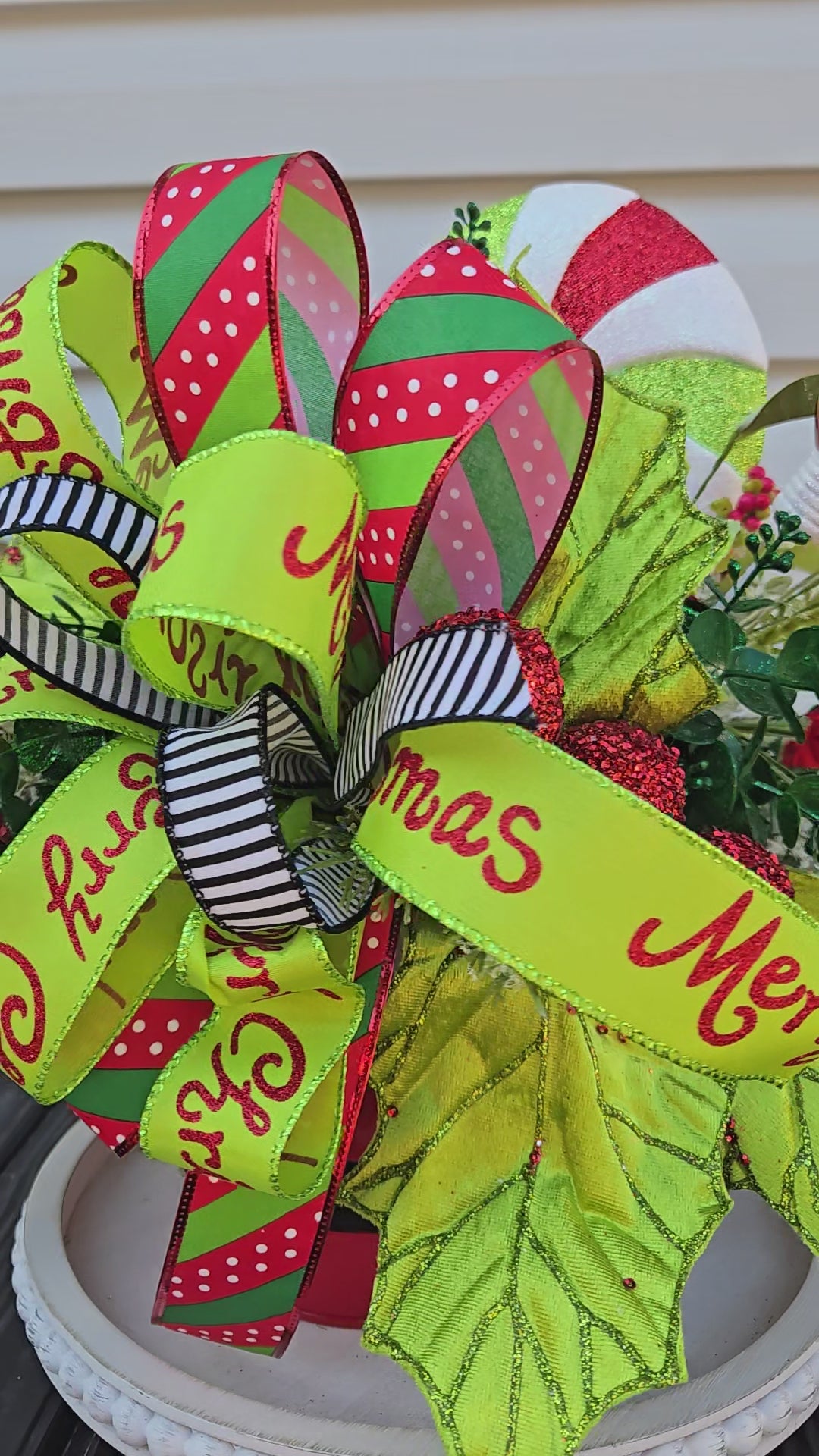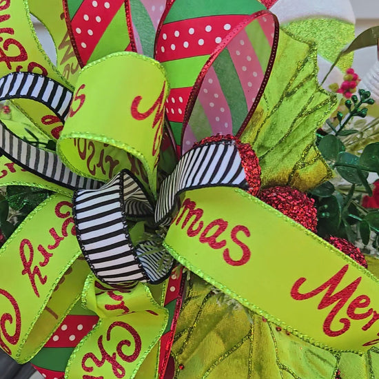 This arrangement features a bold, handcrafted bow made with playful Christmas ribbons — including candy-striped, polka dot, and “Merry Christmas” script. Paired with glitter ornaments, red berries, frosted florals, and oversized red bulb picks, it creates a lively and eye-catching holiday display.